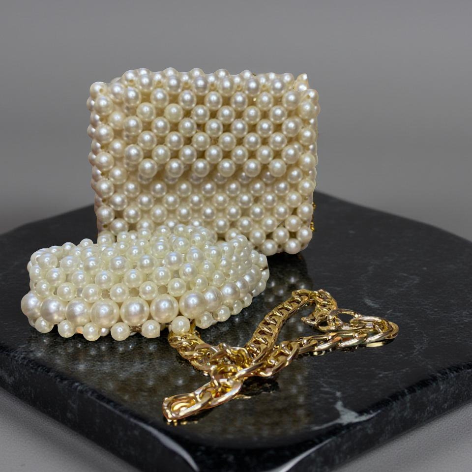 sac ceinture délicatement réalisé entièrement en perles blanches nacrées, accompagné d’un joli bracelet assorti.